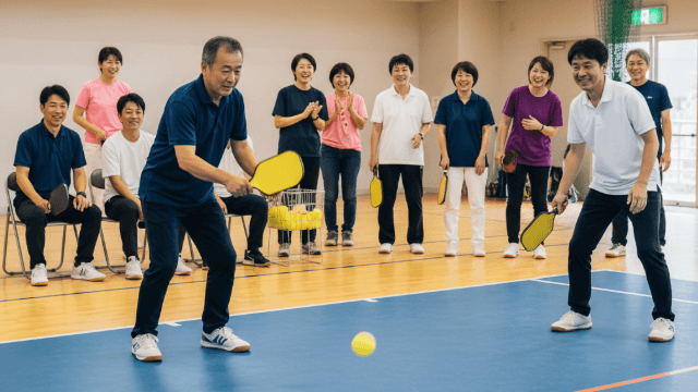 ピックルボールはバドミントンと同じ広さのコートでプラスチック製の穴あきボールを打ち合うスポーツで、テニスほどコートを走り回る必要がなく、俊敏性も卓球ほどには求められないなど、適度な運動量も魅力です。