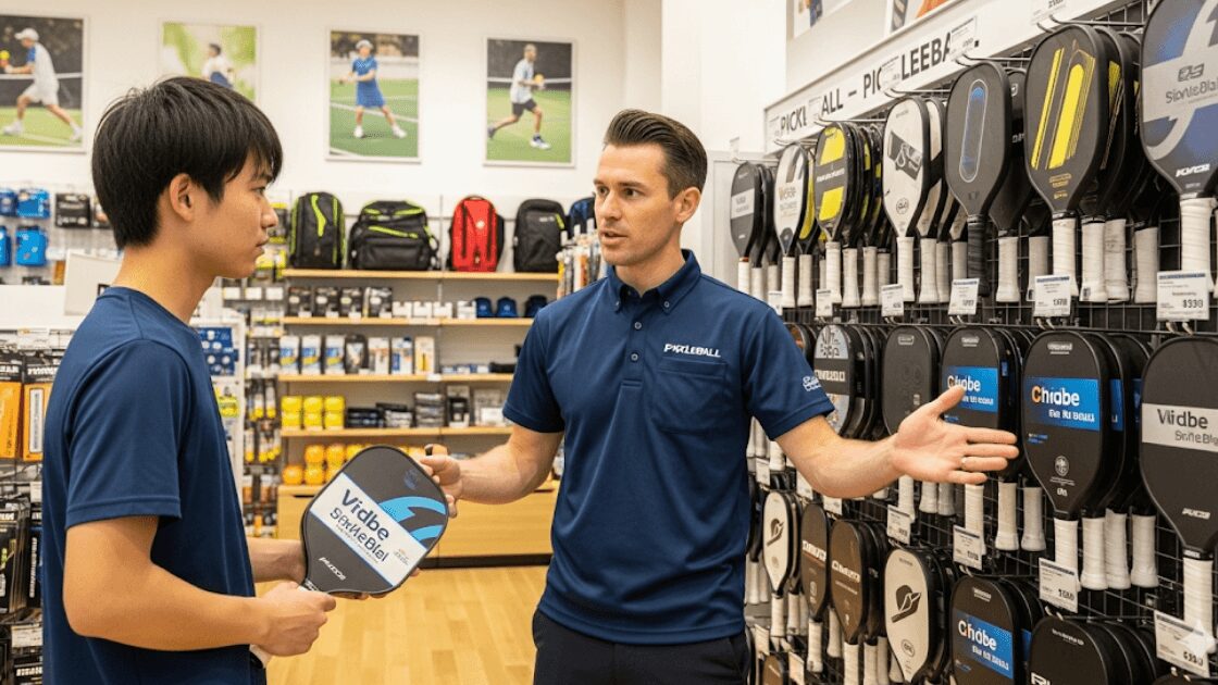 日本人の若い男性客がピックルボール専門店で、知識豊富なスタッフからパドル選びのアドバイスを受けている