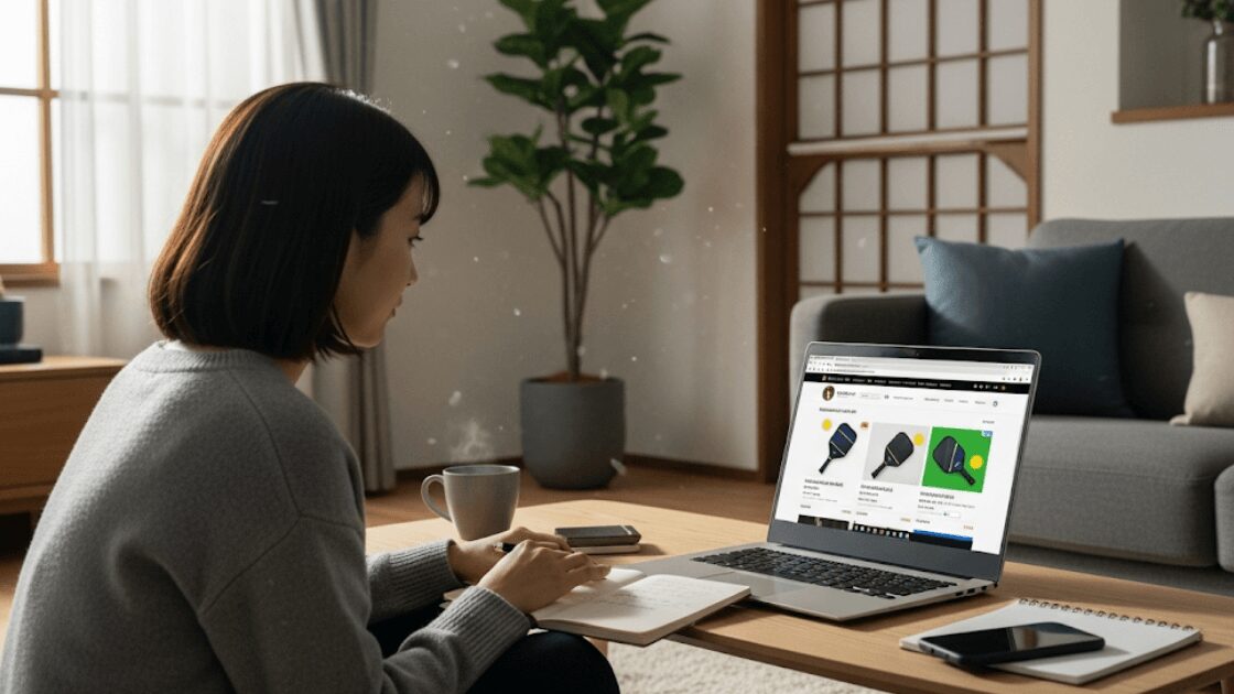 自宅のリビングで、日本人女性がノートパソコンを使いオンラインショップでピックルボールパドルを比較検討