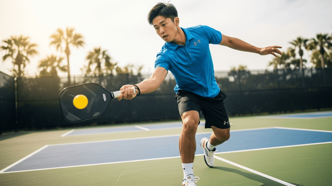 日本人男性選手が屋外のピックルボールコートで力強いフォアハンドを打つダイナミックな瞬間