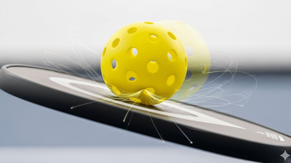 ピックルボールのボールがパドルに当たり、強烈なトップスピンがかかっている様子