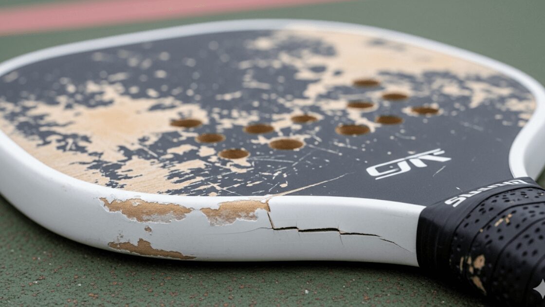 表面のグリットが摩耗し、エッジガードがひび割れている使い古されたピックルボールパドル