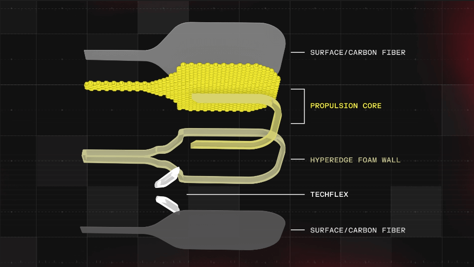 この理論をパドルに応用することで、打点が中心から多少ズレてもパワーロスや面のブレを最小限に抑え、安定したショットを可能にしています。