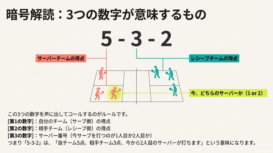 もし「5-3-2」と聞こえてきたら、「リードしている方が2人目のサーバーだから、次ミスをしたらサーブ権が交代だな」と即座に状況を判断できるわけです。