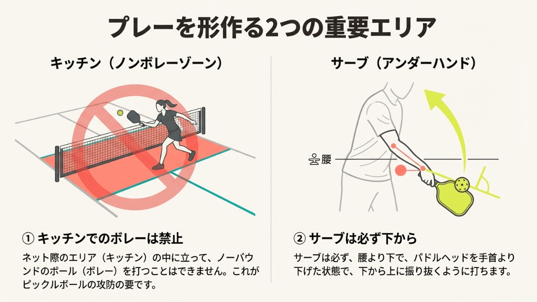 ノンボレーゾーン(キッチン)でのボレー禁止と、腰より下から打つアンダーハンドサーブの規定を示す図