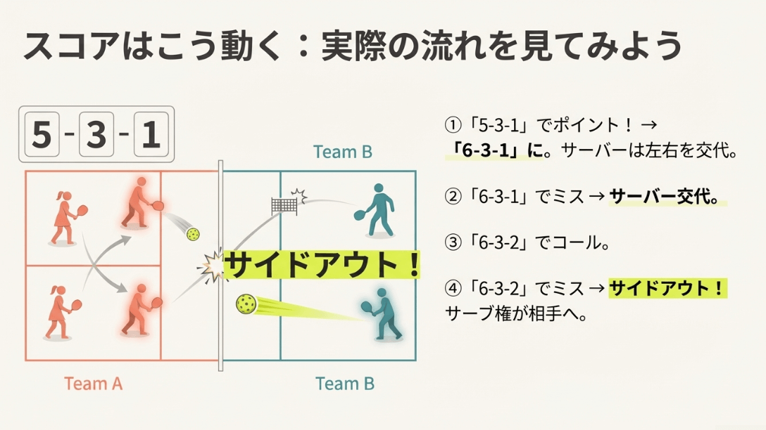 • レシーブ側が勝利:点数は動かない。サーブ権がサーバー2へ移動、または相手チームへ移動(サイドアウト)。