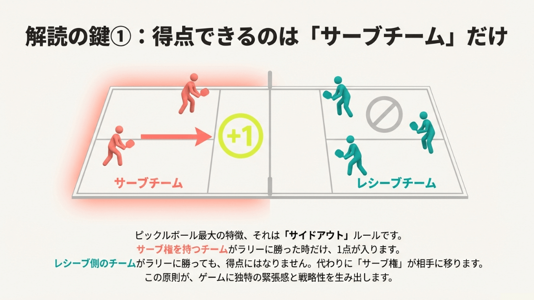 ピックルボールのスコアを理解する上で最も重要なのが「サイドアウト制」という仕組みです。これは、得点(ポイント)を獲得できるのが「サーブを打っている側のチーム」に限られるというルールです。昔のバレーボールのルールというと理解しやすい方も多いかもしれません。