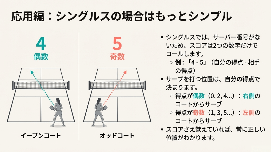 ピックルボールはダブルスが主流のスポーツですが、シングルスも非常にダイナミックで楽しい種目です。シングルスの場合、スコアコールは「自分の得点 – 相手の得点」という2つの数字だけで行います。