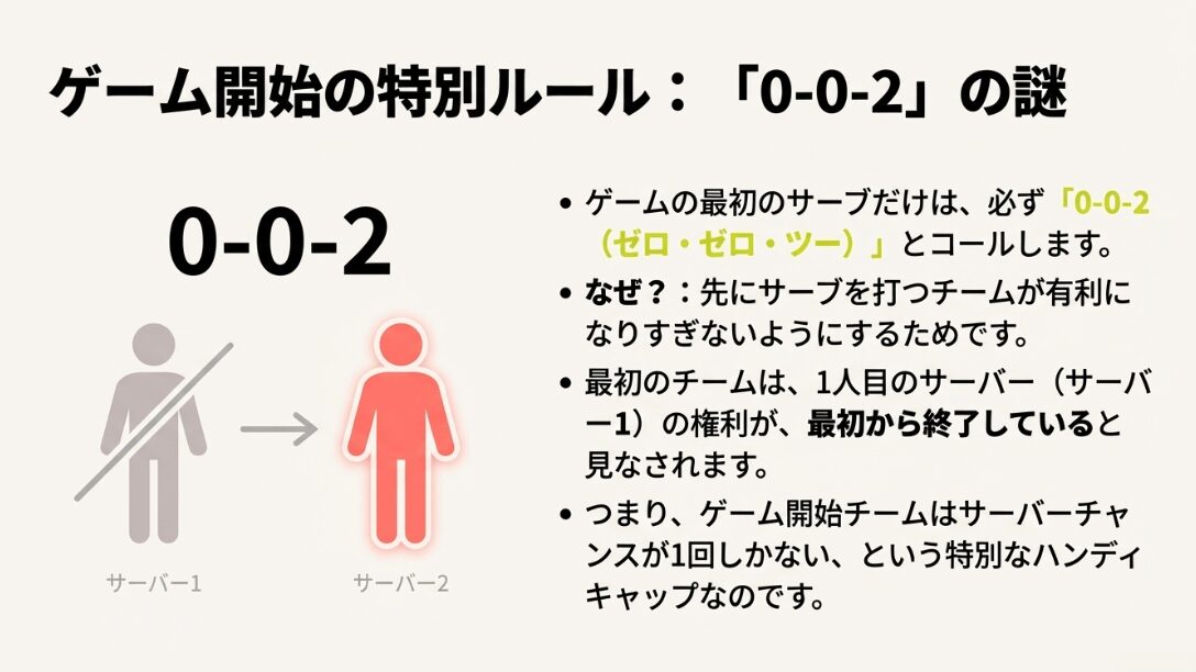 ロジックとしては、「サーバー1がすでに終わった状態」とみなして、2人目のサーバーであることを示す「2」をコールします。最初は少し違和感があるかもしれませんが、これは世界共通のルールです。