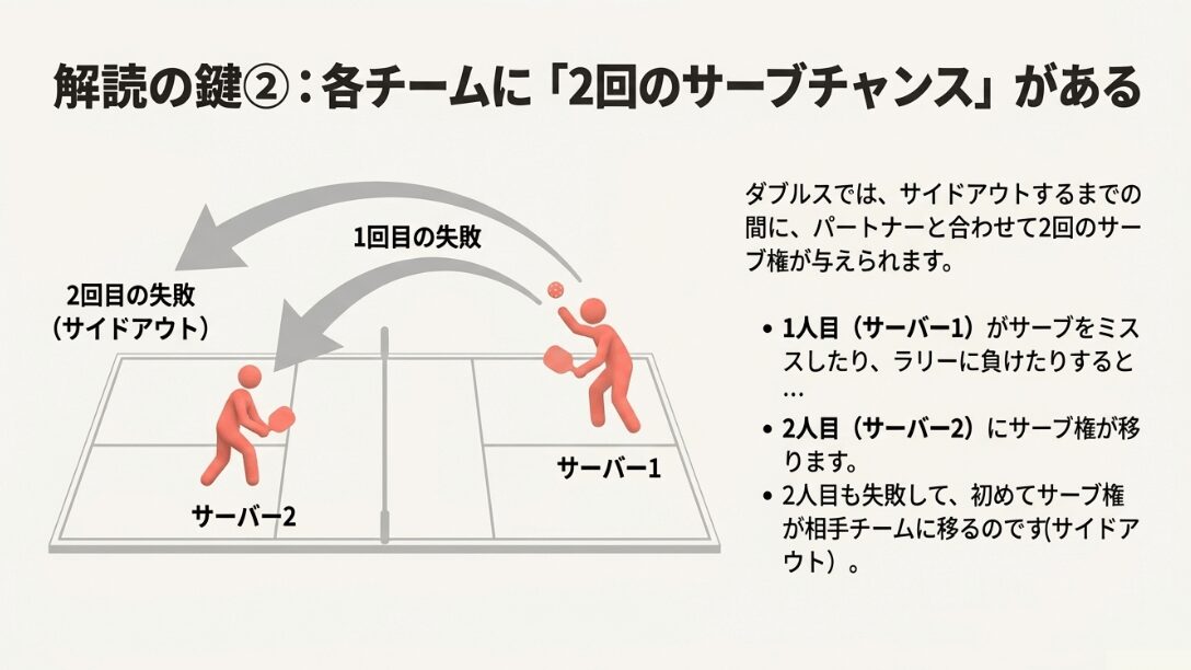 ここで重要かつ少しややこしいのが3番目の数字「サーバー番号」です。ダブルスでは、1回のサイドアウト(サーブ権の保持期間)の間に、チームの二人がそれぞれ一度ずつサーブを打つ権利を持っています。