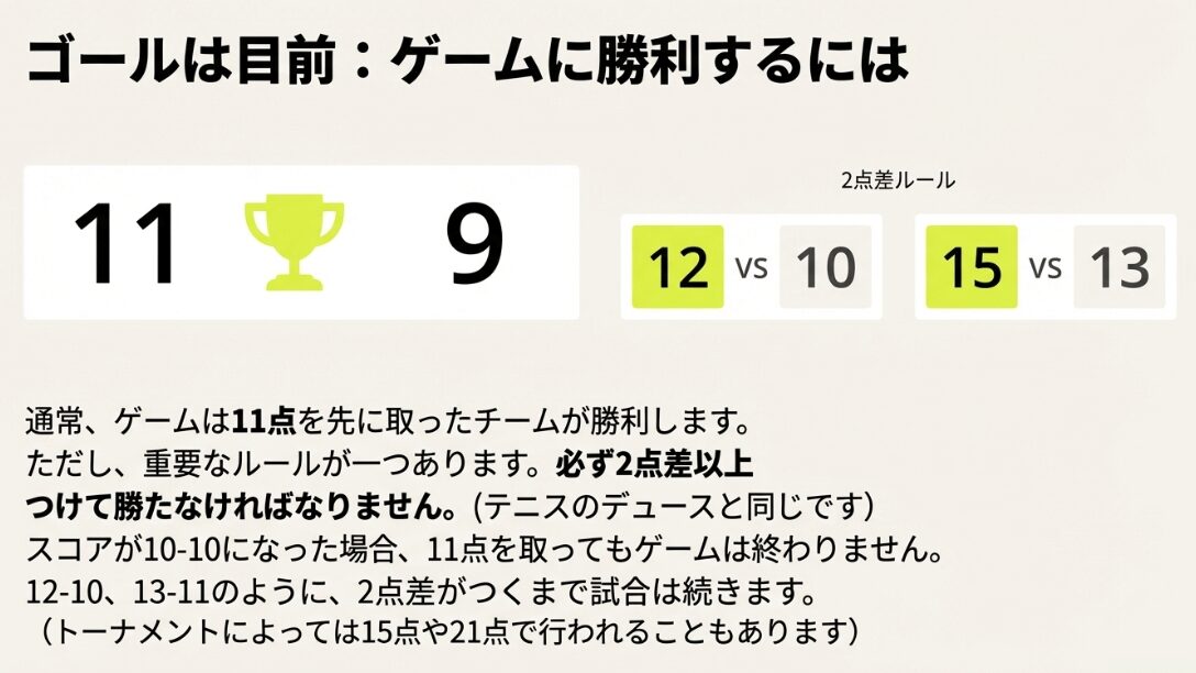 私も10対10からの長いラリーでヘトヘトになったことがありますが、その分勝った時の喜びはひとしおです。なお、大会によっては「3ゲーム中2ゲーム先取(2-out-of-3)」で勝者を決めることも多く、この場合はスタミナ配分も大切な戦略になります。