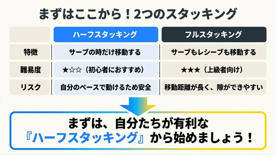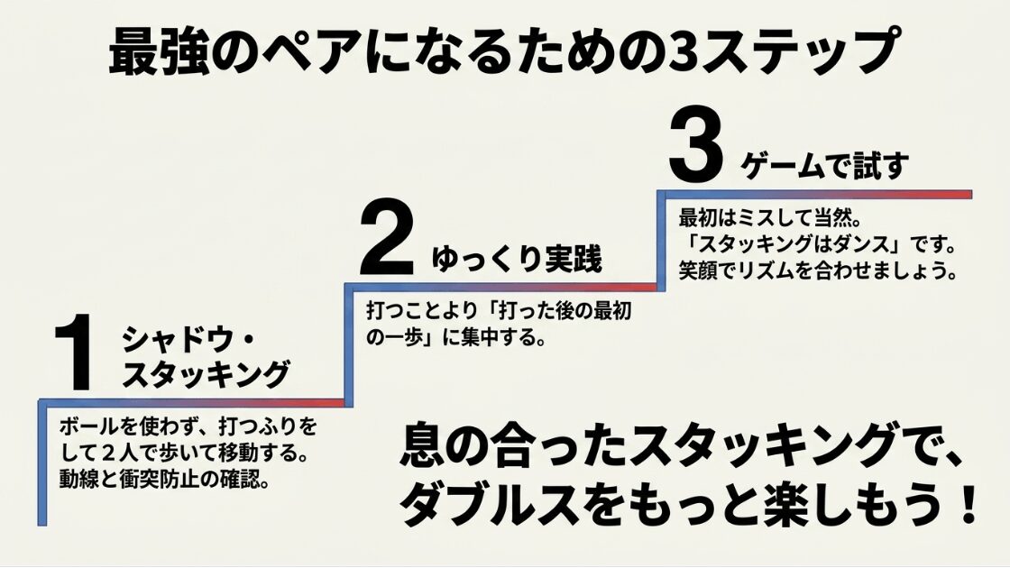 自分たちのレベルや相手の強さに応じて、どこまでスタッキングを採用するかを戦略的に選べるようになると、ダブルスはもっともっと楽しくなるはずです!