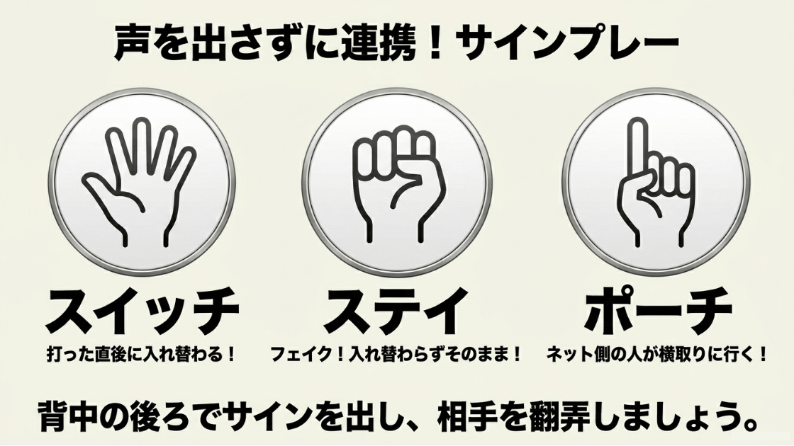 | 人差し指を立てる | ポーチ(インターセプト) | ネットプレーヤーが横に動いてボールを奪いに行く。 |