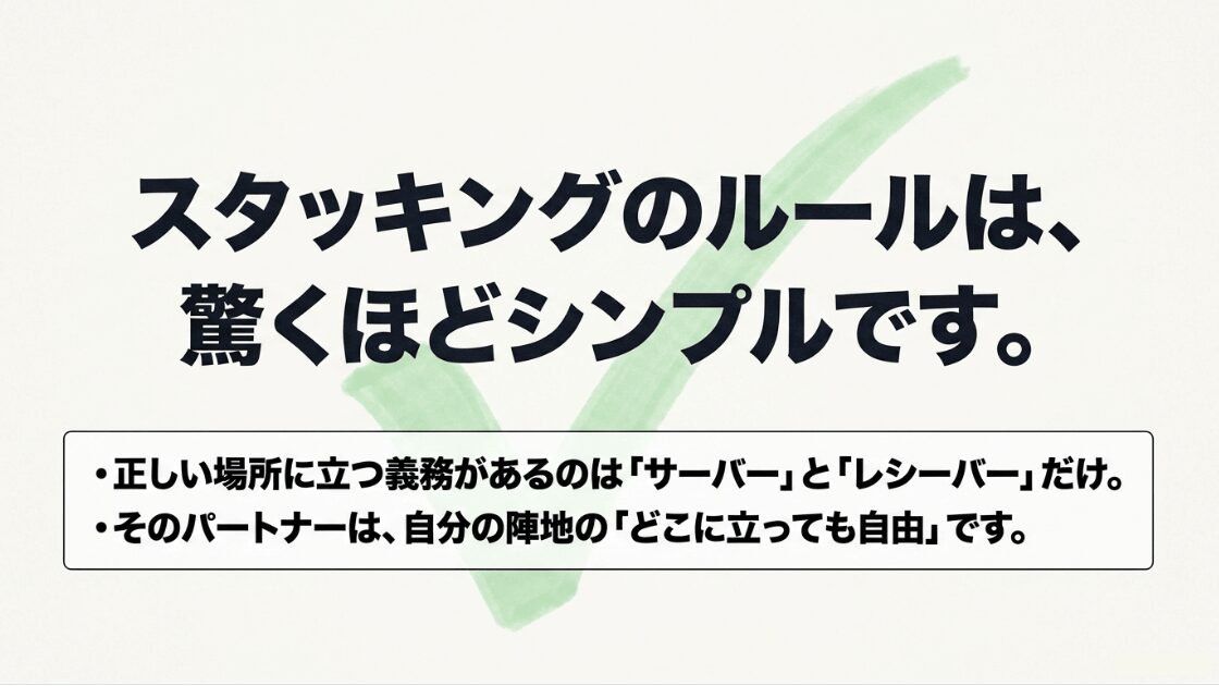 よくある勘違いとして、「スタッキングをすると混乱してルール違反を犯しやすい」と思われがちですが、実際にはパートナーと常に「今はどっちがサーバー?」「スコアは?」と声を掛け合う習慣がつくため、かえってルールに対する意識が高まることもあります。