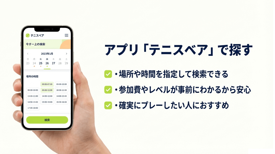 テニスベアはテニスやピックルボールのコート予約やイベント募集に特化したアプリで、地図から広島県内の開催情報を検索でき、ワンタップで申し込みが完了します。