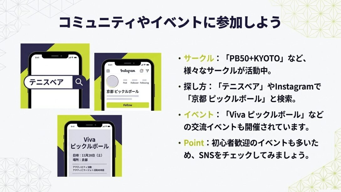 では、どうやってサークルを見つければいいのかというと、最近の主流は、スポーツ予約アプリの「テニスベア」や、Instagram、Facebookでの検索です。「京都 ピックルボール サークル」等と検索すれば、いくつかの団体がヒットするでしょう。