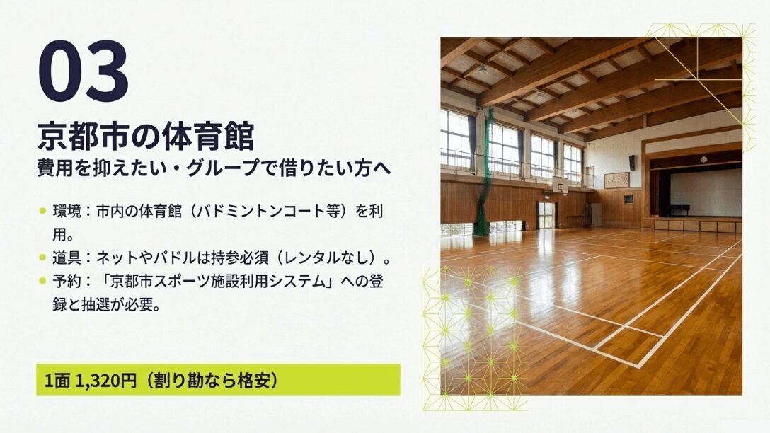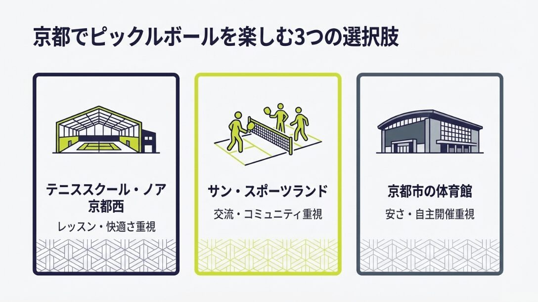 まずは、実際にピックルボールをプレーできる場所を具体的に見ていきましょう。京都には民間が運営する本格的な施設から、自治体が提供するリーズナブルな体育館まで、大きく分けて3つの選択肢があります。それぞれの特徴を知ることで、自分にぴったりの「最初の一歩」が見つかるはずです。