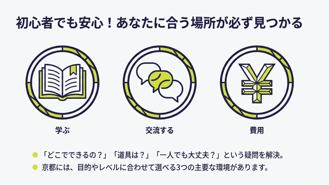 京都には教わるための「スクール」、交流を楽しむための「サークル」、そして単発の「イベント」と、大きく分けて3つの入り口があります。それぞれの特徴を深掘りして、あなたに最適なデビュープランを考えていきましょう!