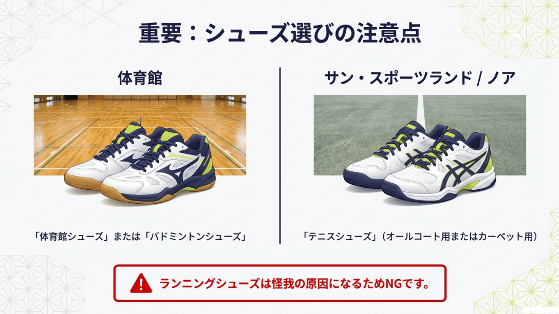せっかく体験を楽しみに会場へ足を運んでも、管理スタッフの方から「その靴ではコートに入れません」と断られてしまったら悲しいですよね…。特に公共施設では、床材の保護のためにこのルールが厳格に運用されていることが多いので、事前の確認が不可欠です。