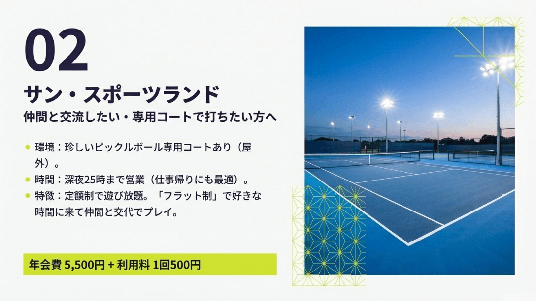 「昼間は忙しくてとてもスポーツなんて無理!」という働き盛りの皆さんに朗報なのが、京都のピックルボール環境の「夜の強さ」です。伏見区のサン・グリーンスポーツは、なんと営業時間が深夜25時までという、スポーツ施設としては異例の対応をしています。