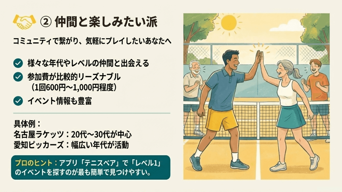 | サークル主催練習会 | 一人でも参加可、安価、仲間ができる | 開催日時が限定的、Lvの確認必須 | ★★★★☆ | テニスベアの活用がベスト |