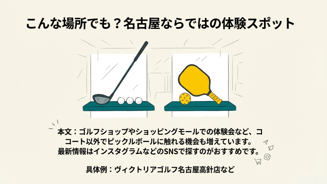 愛知県内、特に名古屋周辺でピックルボール熱が最も高まっているのは、単なるスポーツ施設だけではありません。最近では意外な場所でも体験イベントが開催されるようになっています。