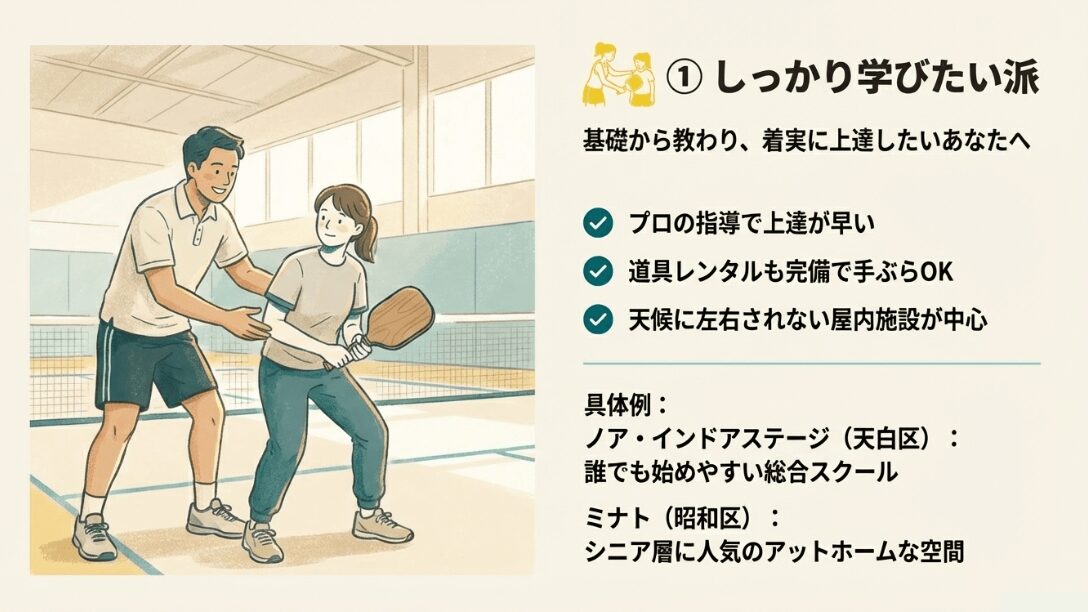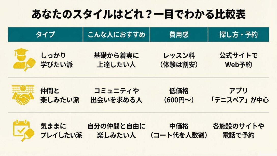 | 民間スクール・コート | Web即時予約、レンタル完備、空調あり | 料金が高め(1時間3,000円〜) | ★★★★★ | 手軽さ重視ならここ |