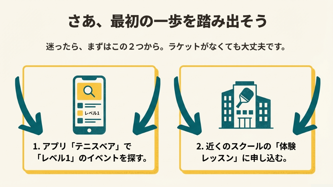 迷っている時間は本当にもったいないです!まずはテニスベアで名古屋の「Lv1」イベントを探してみるか、お近くのスクールの体験ページをクリックしてみてください。その一歩があなたの日常を劇的に楽しく変えてくれるはずです。