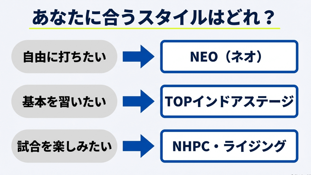 自由に打ちたいならNEO、基本を習いたいならTOP、試合を楽しみたいならNHPC・ライジングというスタイル別ガイド。