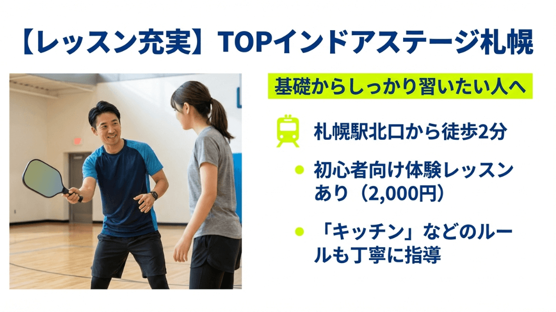 現時点で、札幌市内のすべてのテニススクールでピックルボールが学べるわけではありませんが、未経験者を対象とした短期講習や、一般開放枠でのワンポイントアドバイスを行う施設が増えています。