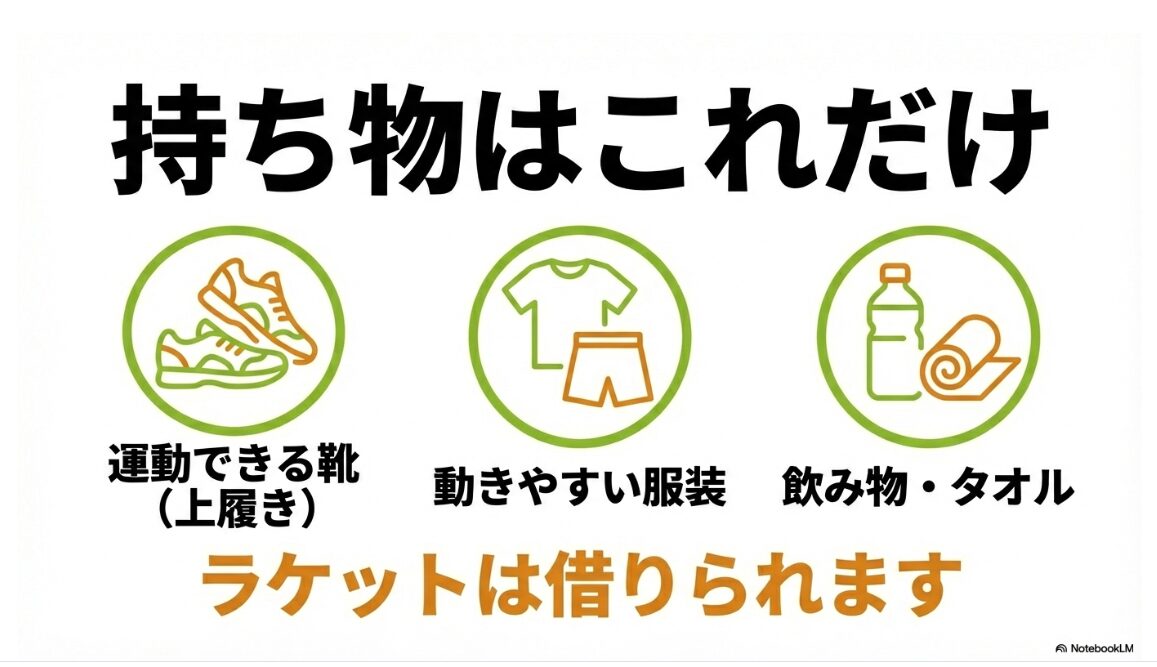 室内シューズ、動きやすい服装、飲み物などの準備品ガイド