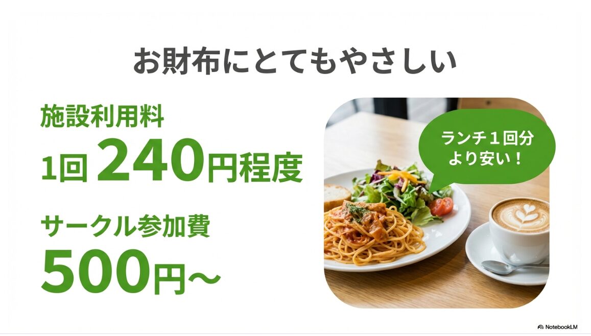 1回240円からの施設利用料と、ランチ代より安いサークル参加費の比較画像