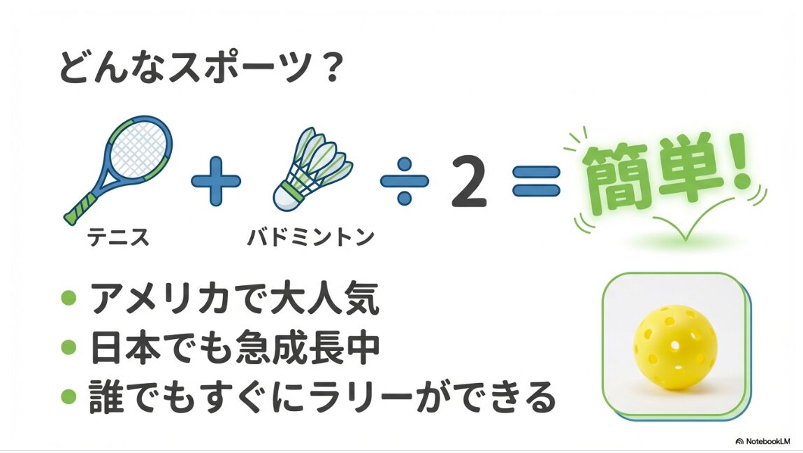 仙台で始める新しい趣味、初心者向けスポーツ「ピックルボール」の紹介スライド表紙 ピックルボール