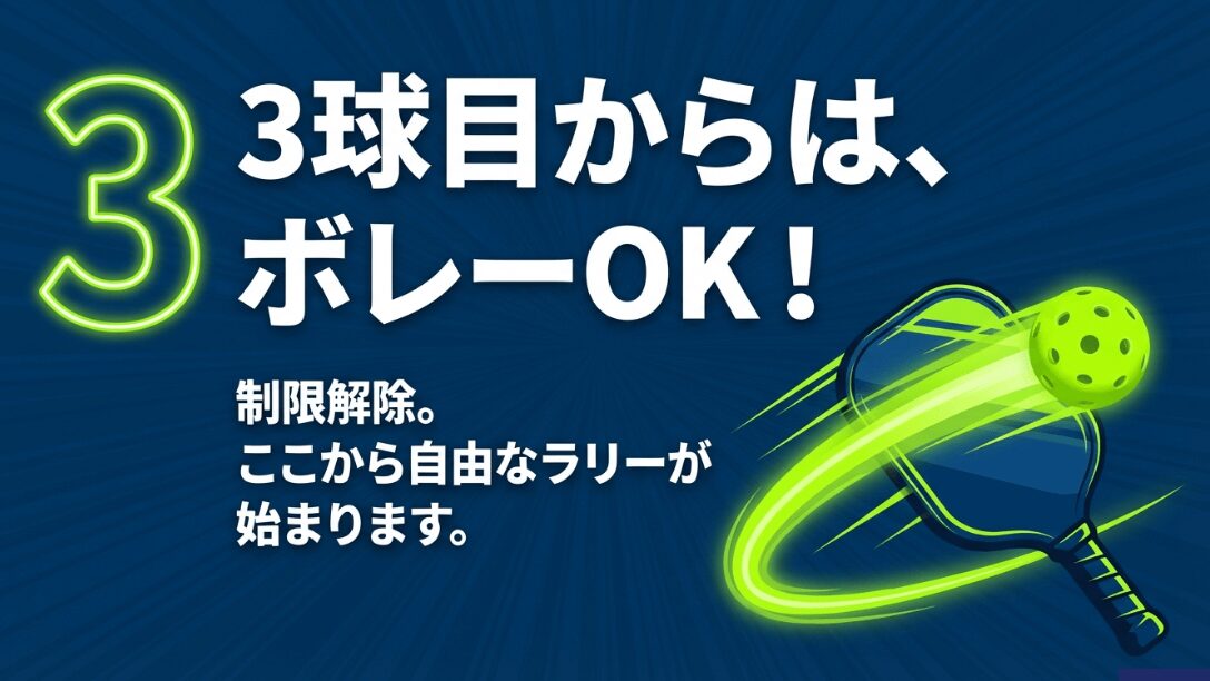 この合計2回のバウンド(ツーバウンド)が完了した後の「3打目」において、初めて空中で直接打つボレーが許可されるという仕組みです。