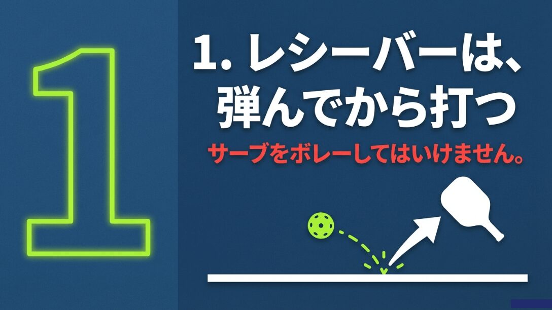 まずサーバーが放ったサーブは、レシーバー側のサービスコートで必ず一度バウンドしなければなりません。レシーバーはこれをノーバウンドで打ち返すことはできず、必ず一度跳ねてからリターンを打ちます。