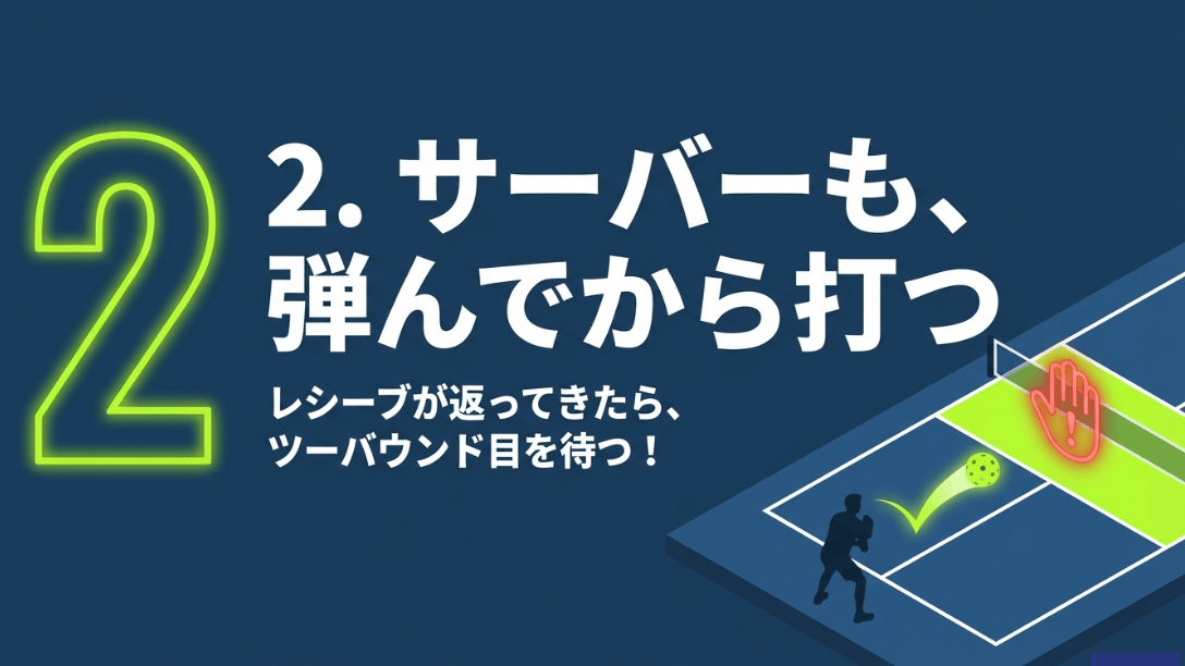 サーブ側の圧倒的なパワーを抑制し、レシーバー側に戦略的な機会を与え、最終的にすべてのプレーヤーをネット際での高度な技術戦へと誘う。このツーバウンドルールこそが、ピックルボールというスポーツの心臓であり、アイデンティティそのものなのです。