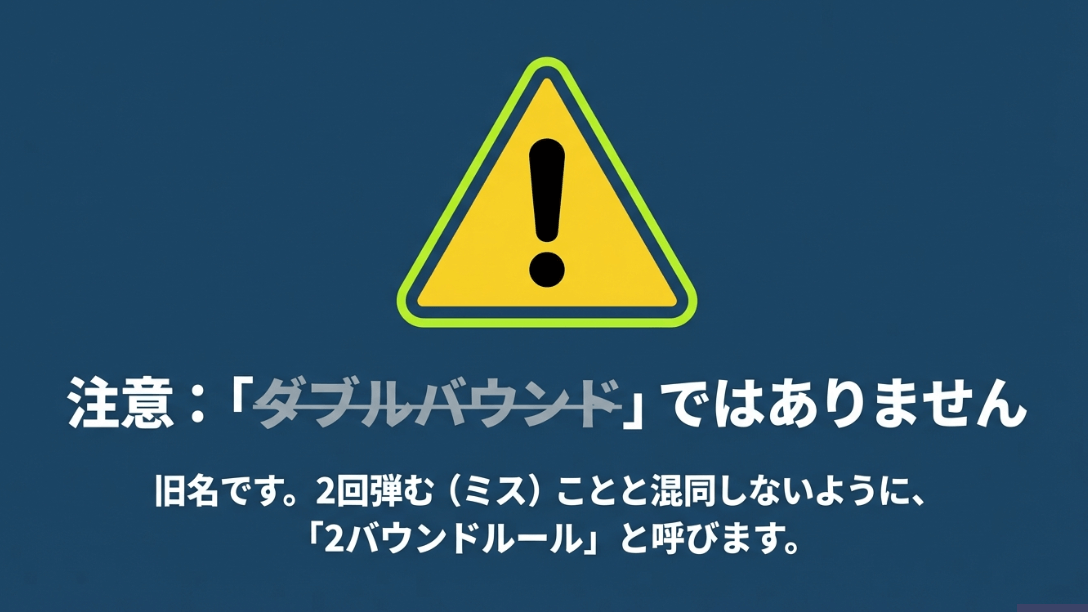 余談になりますが、以前まではツーバウンドルールは「ダブルバウンスルール」と呼ばれていました。しかし、2018年の公式ルール改訂によって「ツーバウンドルール(Two-Bounce Rule)」へと名称が統一された経緯があります。