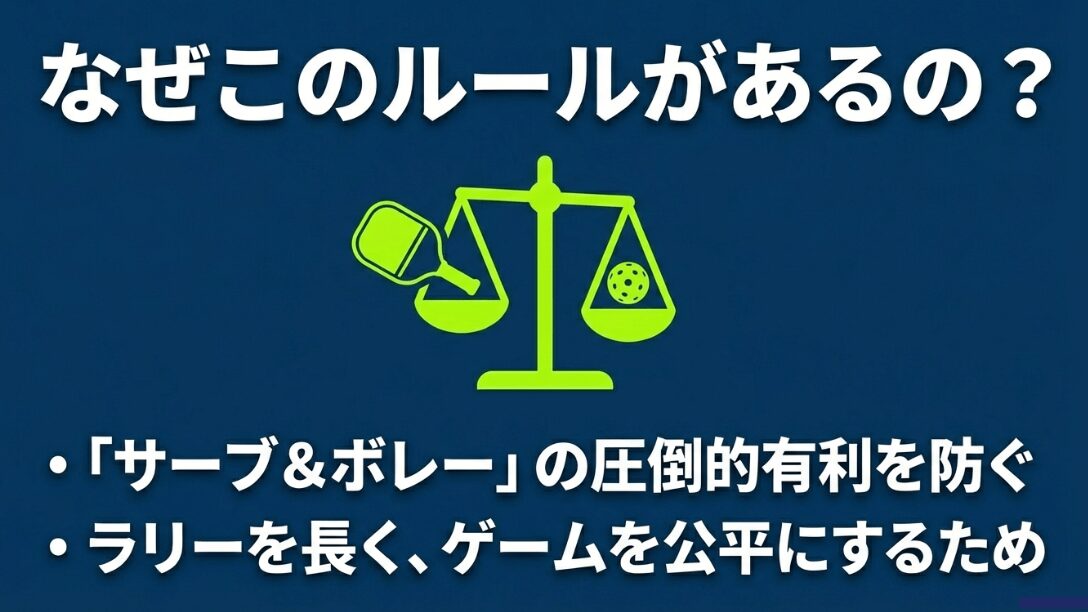 ピックルボールにおいてツーバウンドルールが存在する最大の理由は、「サーブ側が圧倒的に有利になるのを防ぐため」というのが、一般的な認識です。